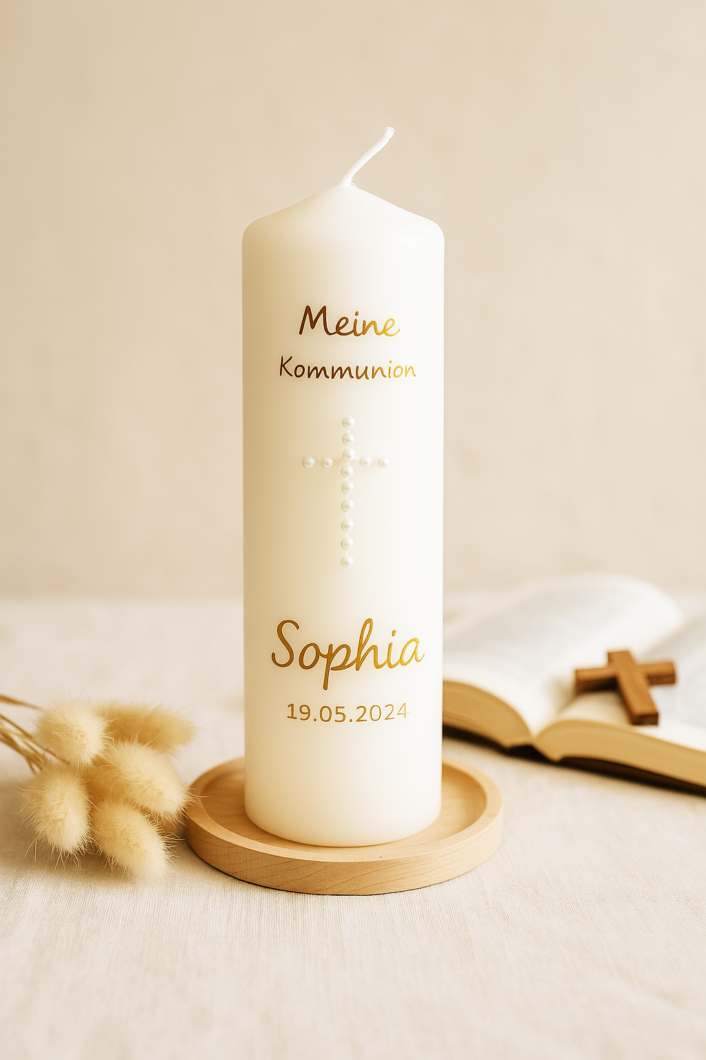 Ob Konfirmation oder Erstkommunion – unsere Kerzen sind liebevoll gestaltete Begleiter auf dem Weg des Glaubens. Mit individuellen Motiven, Namen und Daten personalisierbar, setzen sie ein starkes Zeichen der Verbundenheit mit Gott und bleiben als Erinnerungsstück ein Leben lang erhalten.