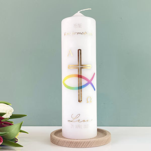 Ob Konfirmation oder Erstkommunion – unsere Kerzen sind liebevoll gestaltete Begleiter auf dem Weg des Glaubens. Mit individuellen Motiven, Namen und Daten personalisierbar, setzen sie ein starkes Zeichen der Verbundenheit mit Gott und bleiben als Erinnerungsstück ein Leben lang erhalten.