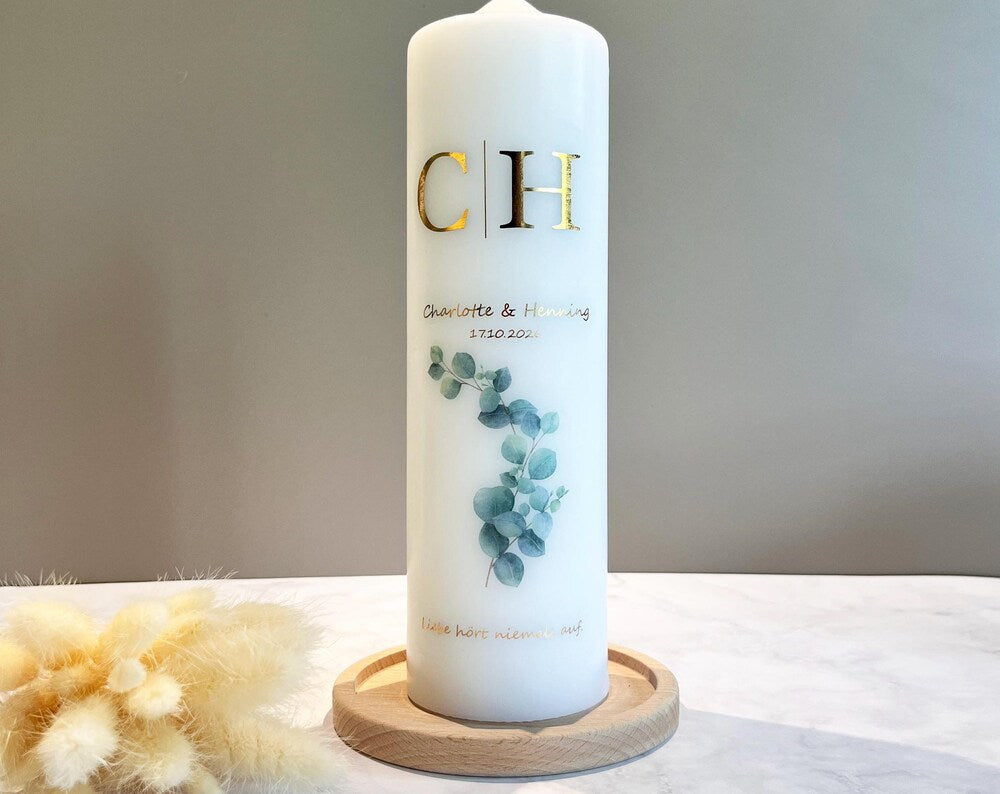 Hochzeitskerze mit Eukalyptus und Trauspruch