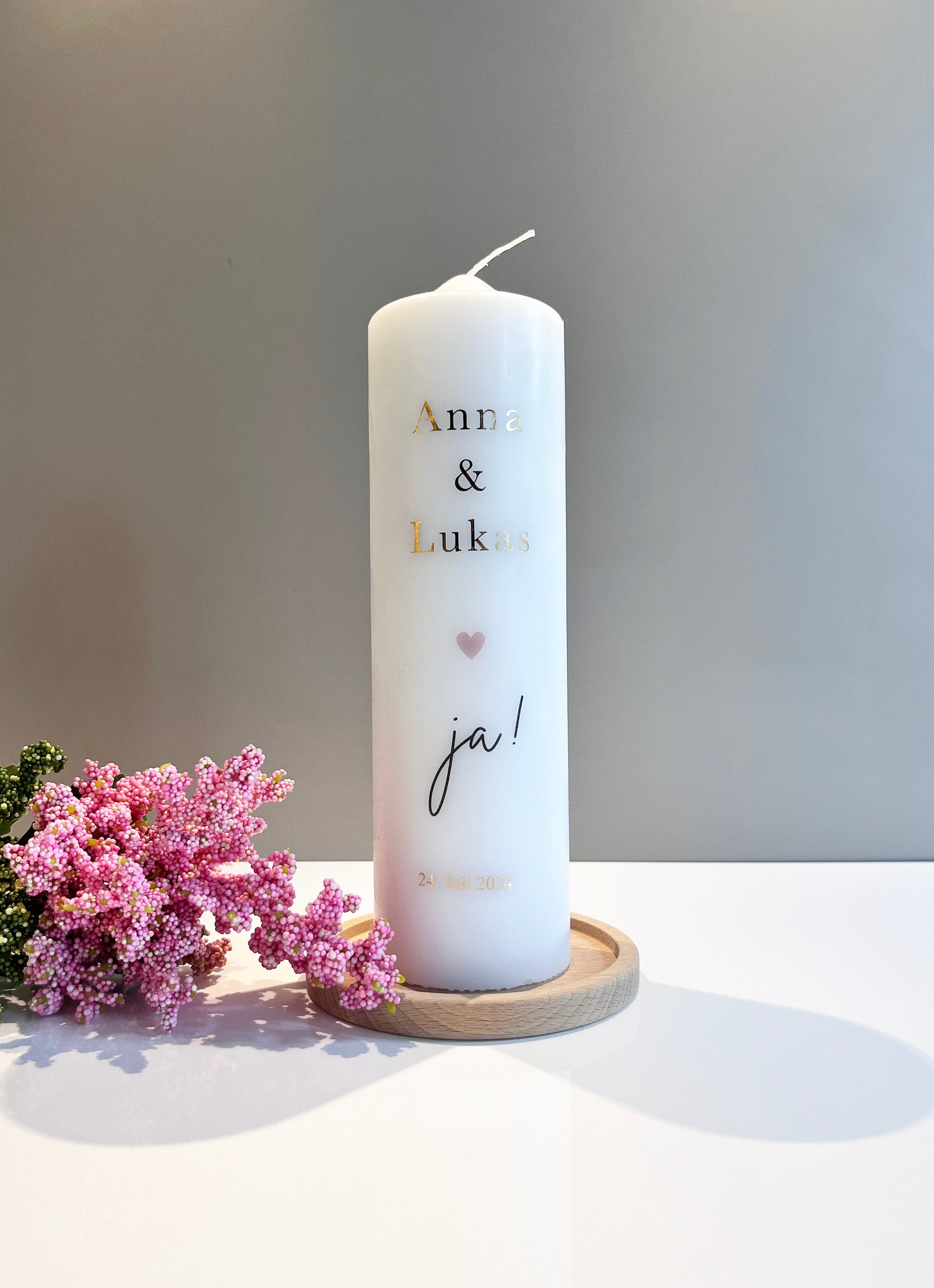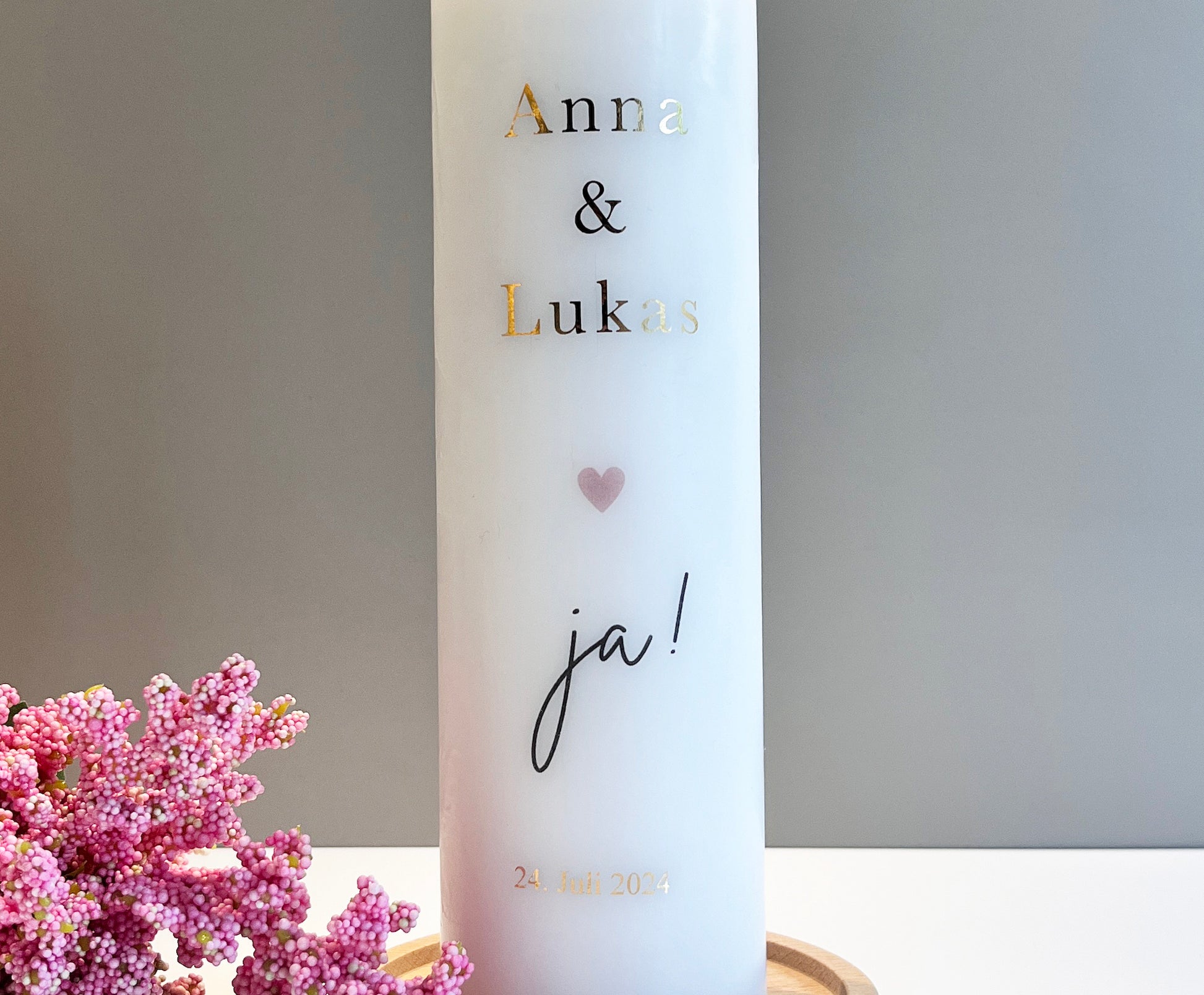 Ein funkelndes „Ja!“ für die Ewigkeit – diese edle, personalisierte Hochzeitskerze vereint romantisches Design mit stilvoller Eleganz. Mit einer glänzenden Metallic-Aufschrift, einem liebevollen Trauspruch und einem zarten rosa Herz gestaltet, wird sie zum emotionalen Highlight eurer Zeremonie. Ideal als Traukerze, individuelles Hochzeitsgeschenk oder unvergessliches Erinnerungsstück. Auf Wunsch mit euren Namen und dem Hochzeitsdatum veredelt.