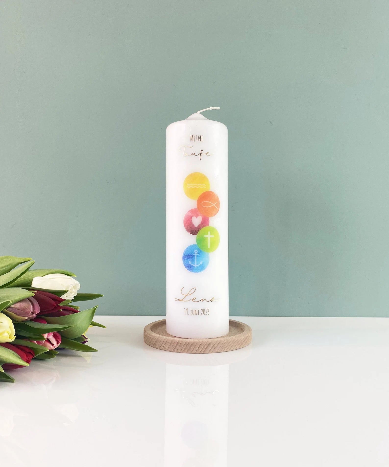 Mit der Möglichkeit zur Personalisierung von Name und Taufdatum wird jede Kerze zu einem einzigartigen Andenken an einen ganz besonderen Tag.