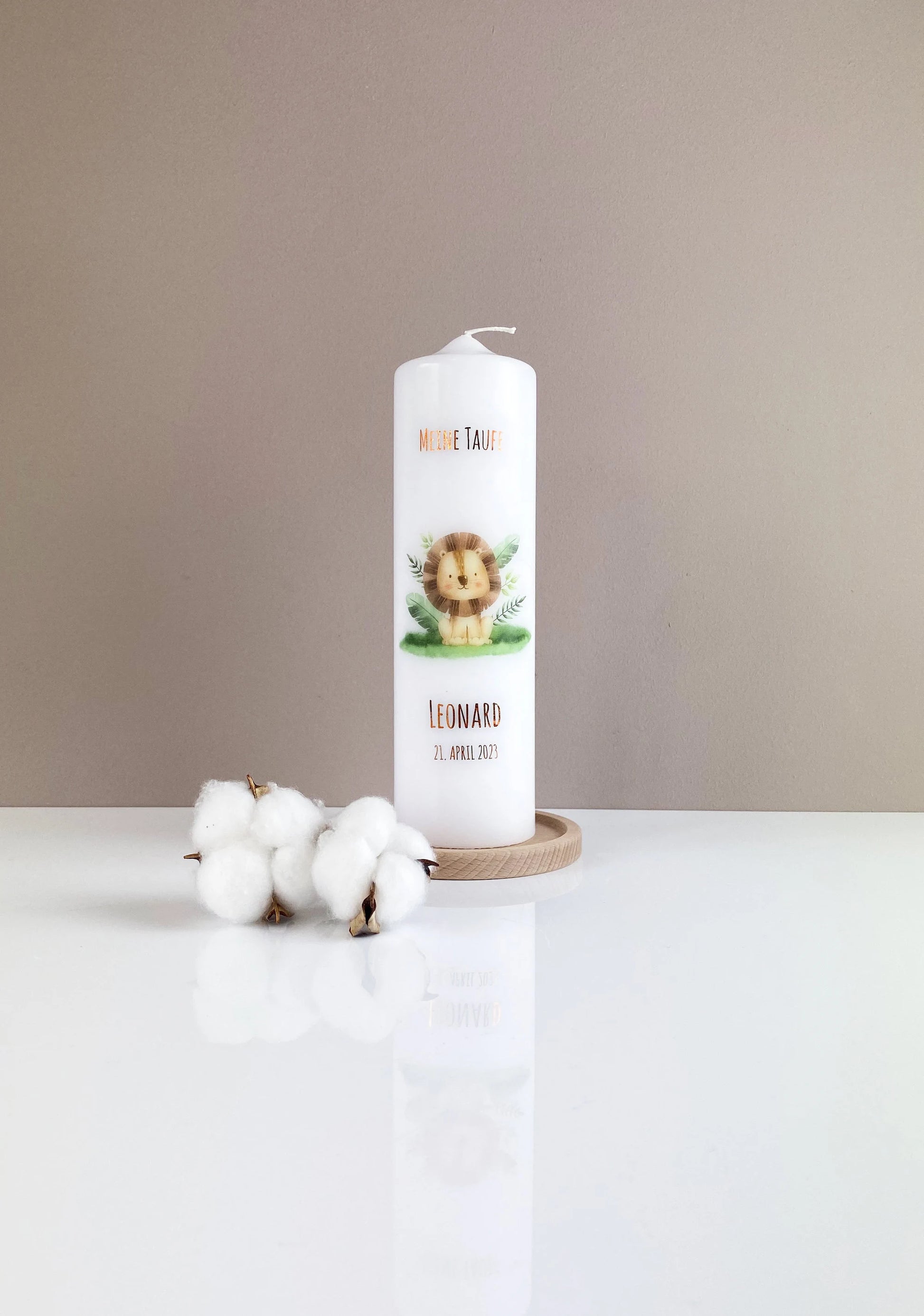 Personalisierte Taufkerze - kleiner Löwe - mit glänzender metallic Schrift.