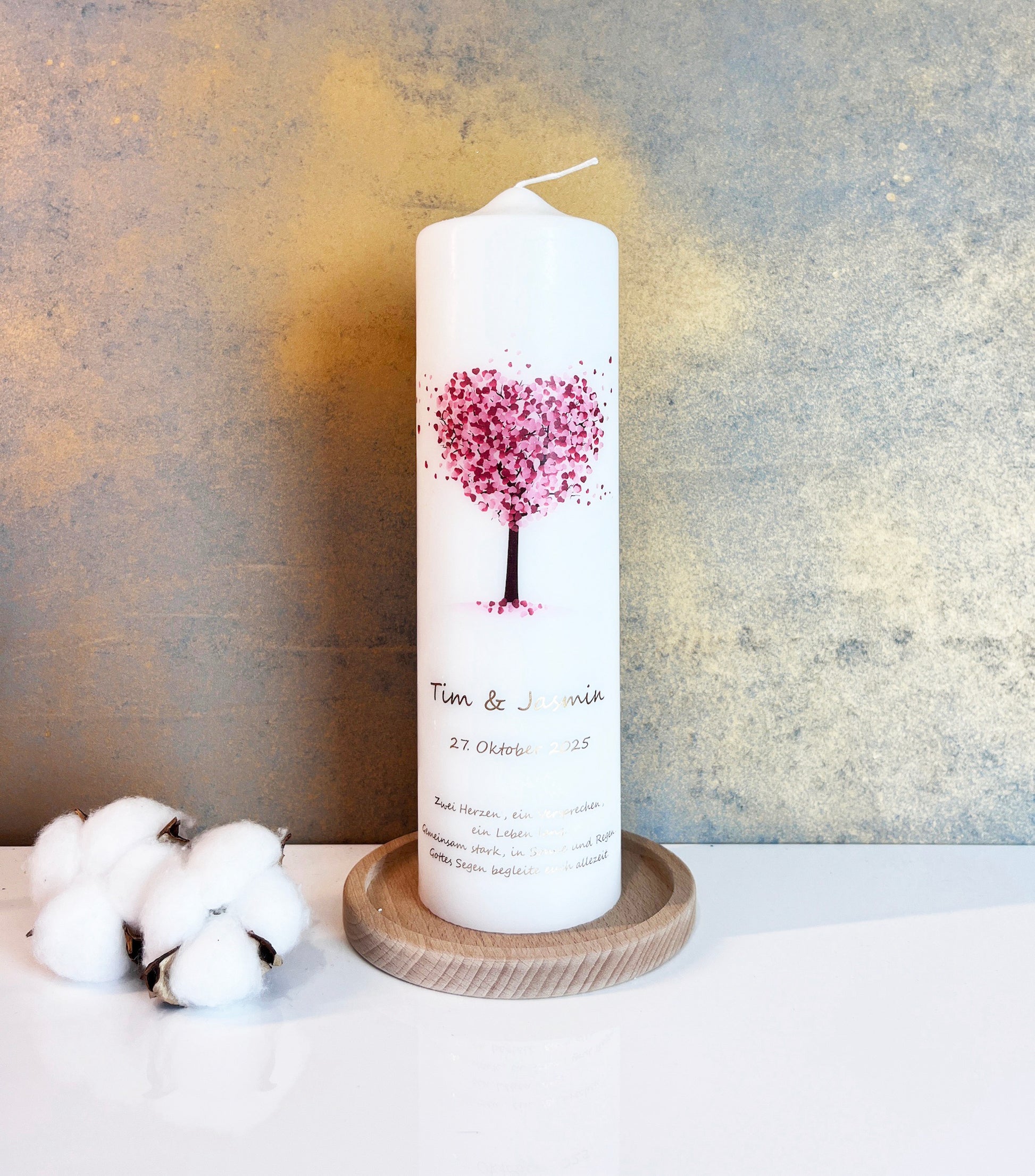 Hochzeitskerze mit rosa Herzbaum, Namen und Trauspruch